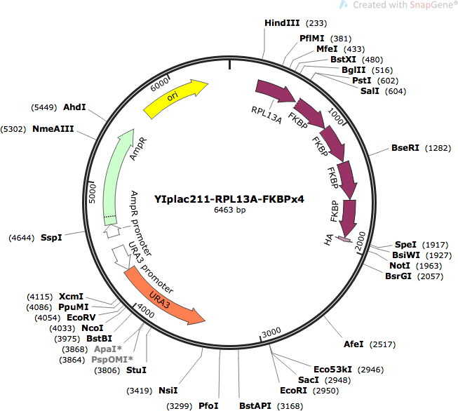 YIplac211-RPL13A-FKBPx4 was a gift from Benjamin Glick (Addgene plasmid # 104474 ; http://n2t.net/addgene:104474 ; RRID:Addgene_104474) -
