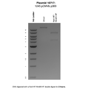 This gel depicts the NEB 1kb ladder and a digestion of the plasmid 1245 pCMVb p300 with the following enzymes: NotI-HF and HindIII-HF.
