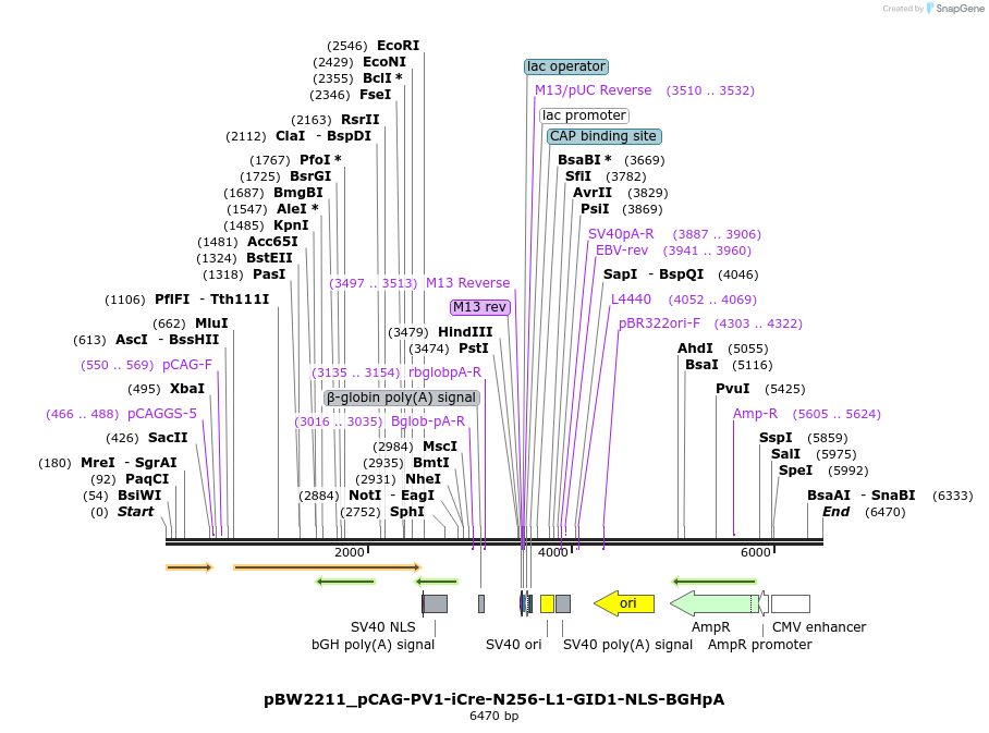 pBW2211_pCAG-PV1-iCre-N256-L1-GID1-NLS-BGHpA Sequences (2)