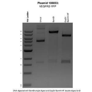 This gel depicts the NEB 1kb ladder and a digestion of the plasmid VEGFR2-YFP with the following enzymes: BsmBI, Esp3I, and BamHI-HF.