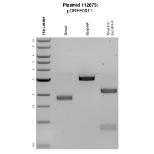This gel depicts the NEB 1kb ladder and a digestion of the plasmid pORFE0011 with the following enzyme(s): NheI-HF and EcoRI-HF.