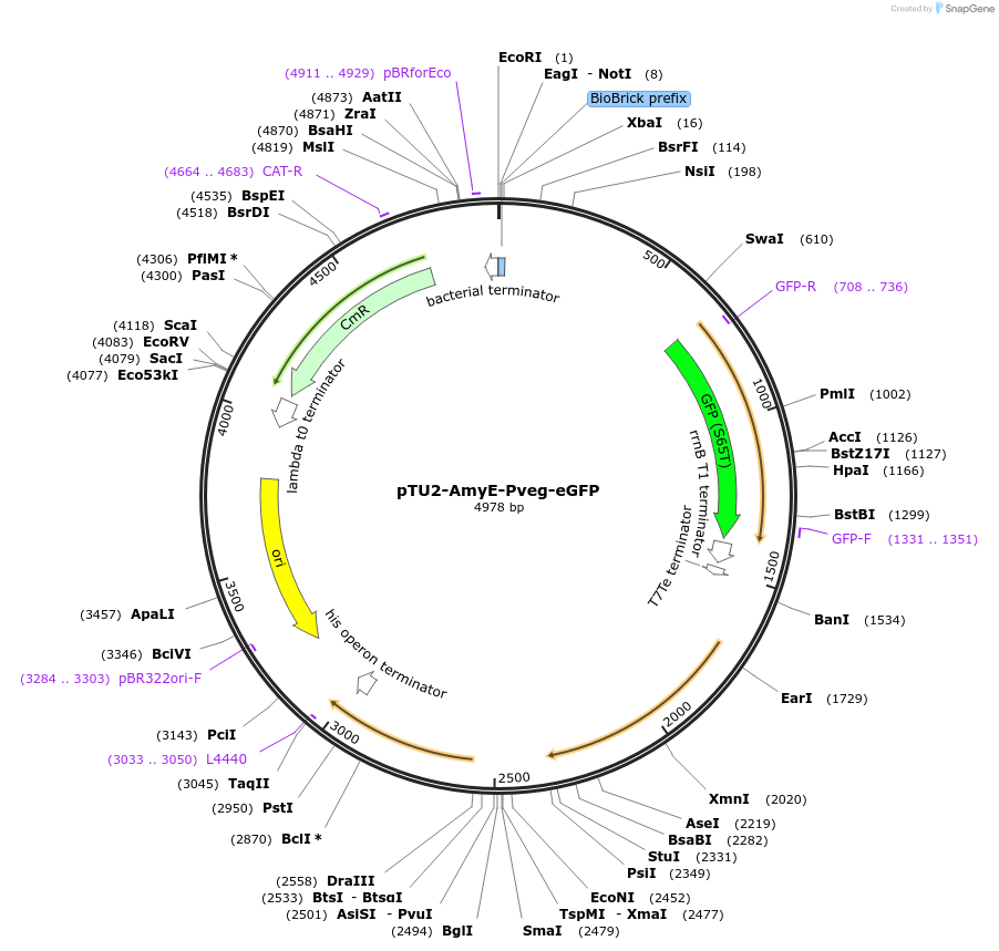 PurposeExpresses GFP under the control of Pveg promoter and it is integrated into AmyE locus. Used to test correct transformation