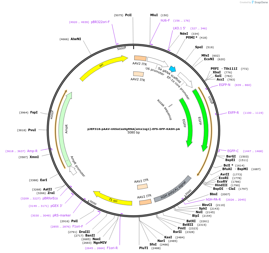 pJEP318-pAAV-U6SaCas9gRNA(emx1sg1)-EFS-GFP-KASH-pA was a gift from Jonathan Ploski (Addgene plasmid # 113695 ; http://n2t.net/addgene:113695 ; RRID:Addgene_113695) -