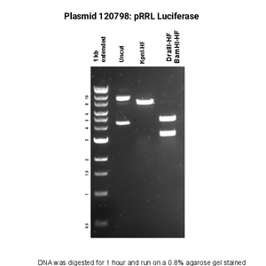 This gel depicts the NEB 1kb extended Ladder and a digestion of the plasmid pRRL Luciferase with the following enzyme(s): Dralll-HF BamHl-HF.