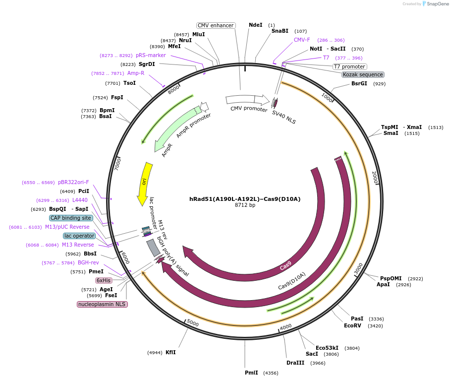 PurposeExpresses the Rad51(A190L-A192L)–Cas9(D10A) fusion construct in mammalian cells under CMV promoter