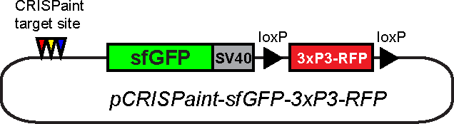 PurposeCRISPaint universal donor plasmid for gene exon insertion. Encodes sfGFP-SV40 and 3xP3-RFP visible eye marker.