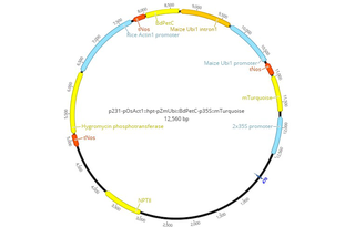 p231-pOsAct1::hpt-pZmUbi::BdPetC-p35S::mTurquoise was a gift from Susanne von Caemmerer (Addgene plasmid # 129650 ; http://n2t.net/addgene:129650 ; RRID:Addgene_129650) -