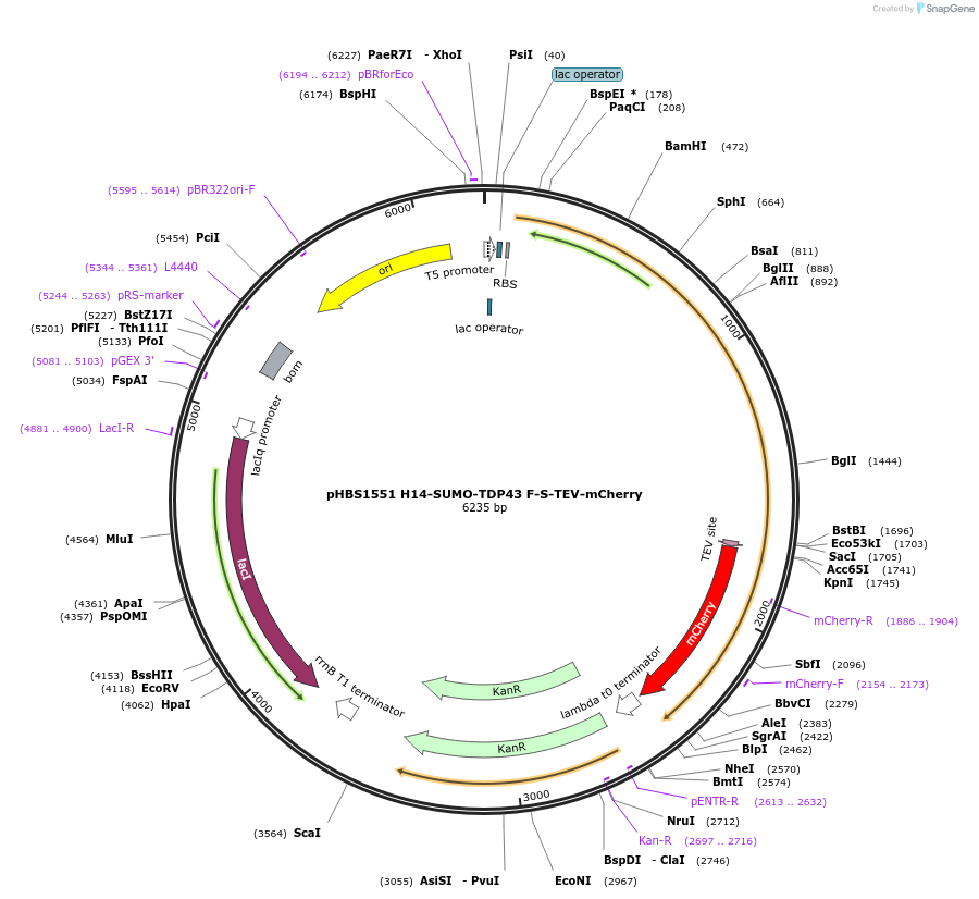 pHBS1551 H14-SUMO-TDP43 F-S-TEV-mCherry