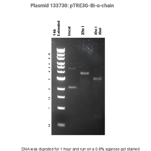 This gel depicts the NEB 1kb extended Ladder and a digestion of the plasmid pTRE3G-Bi-α-chain with the following enzyme(s): Xho I XbaI.