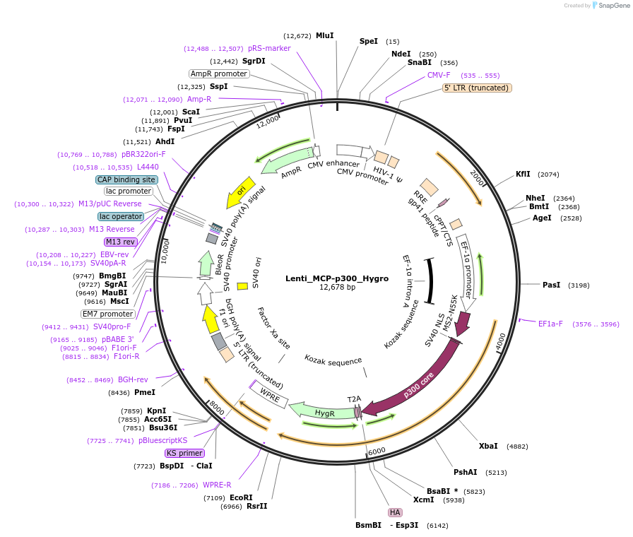 Purposelenti vector encoding the MS2-p300 with a 2A Hygro resistance marker