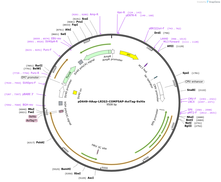 PurposeMammalian expression of cell-surface protein extracellular domain fused to COMP5AP-AviTag-9xHis. Protein is secreted from cells.