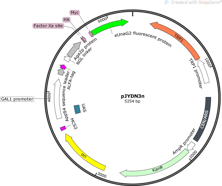 Purpose(Empty Backbone) Yeast display platform plasmid N3 which allows for simultaneous expression of the protein of interest at the N-terminus of Aga2p yeast agglutinin and eUnaG2 or nbALFA detection.