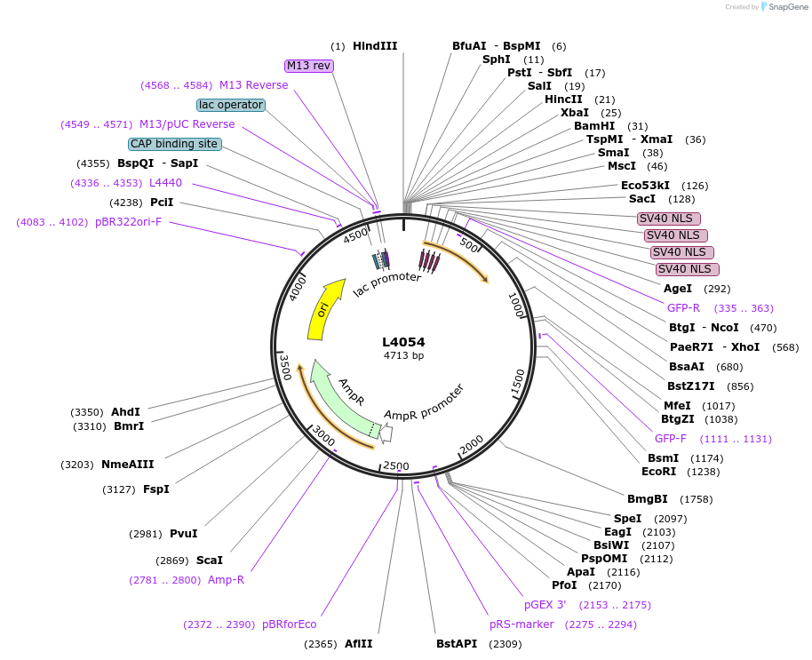 See Fire Lab Vector Kit Documentation 1999. Fire Lab Miniprep Number pPD122.56, Ligation number L4054.