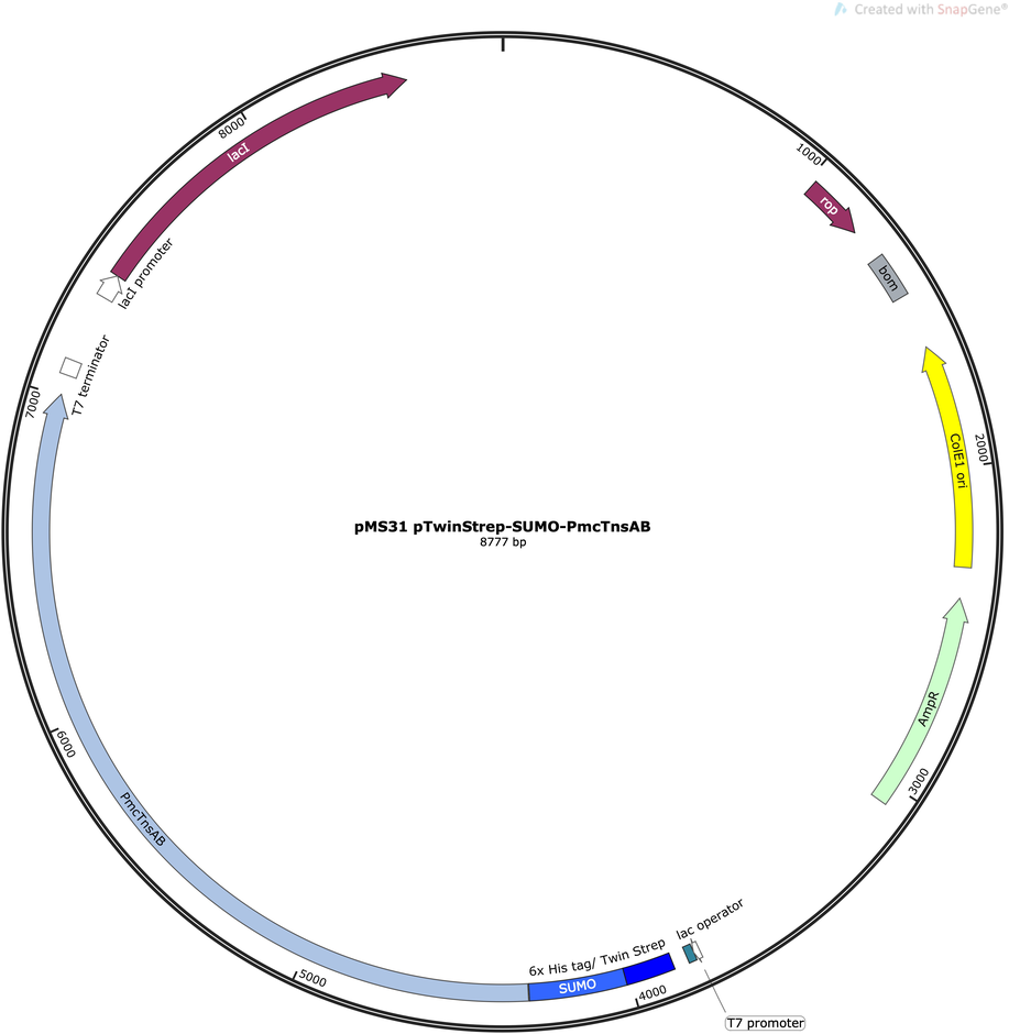 pMS31: pTwinStrep-SUMO-PmcTnsAB was a gift from Feng Zhang (Addgene plasmid # 168164 ; http://n2t.net/addgene:168164 ; RRID:Addgene_168164) -