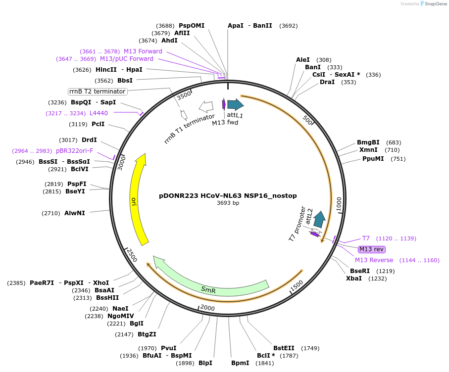 pDONR223 HCoV-NL63 NSP16_nostop was a gift from Fritz Roth (Addgene plasmid # 168663 ; http://n2t.net/addgene:168663 ; RRID:Addgene_168663) -