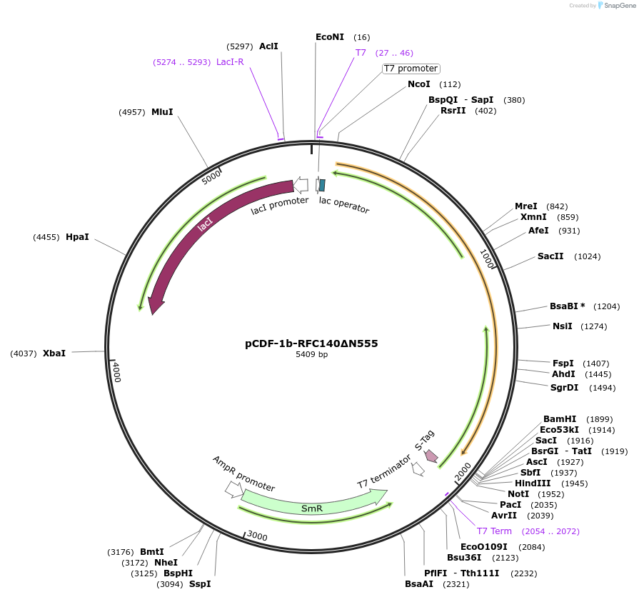 pCDF-1b-RFC140ΔN555 was a gift from Brian Kelch (Addgene plasmid # 175043 ; http://n2t.net/addgene:175043 ; RRID:Addgene_175043) -