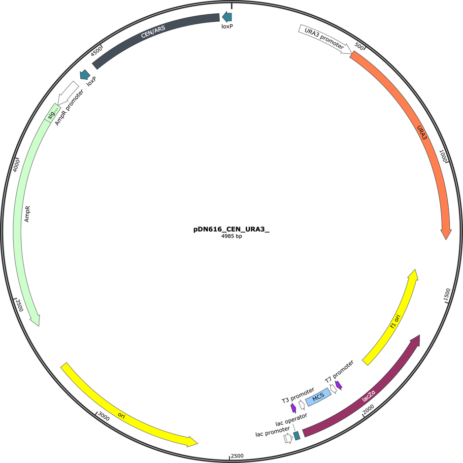 This plasmid was generated by modification of plasmid pRS406 (Sikorski & Hieter, 1989, Genetics 122:19-27) by insertion of CEN6/ARSH4 low copy S. cerevisiae replication and partitioning locus with flanking restriction enzyme cut sites (AatII) and flanking LoxP sites.