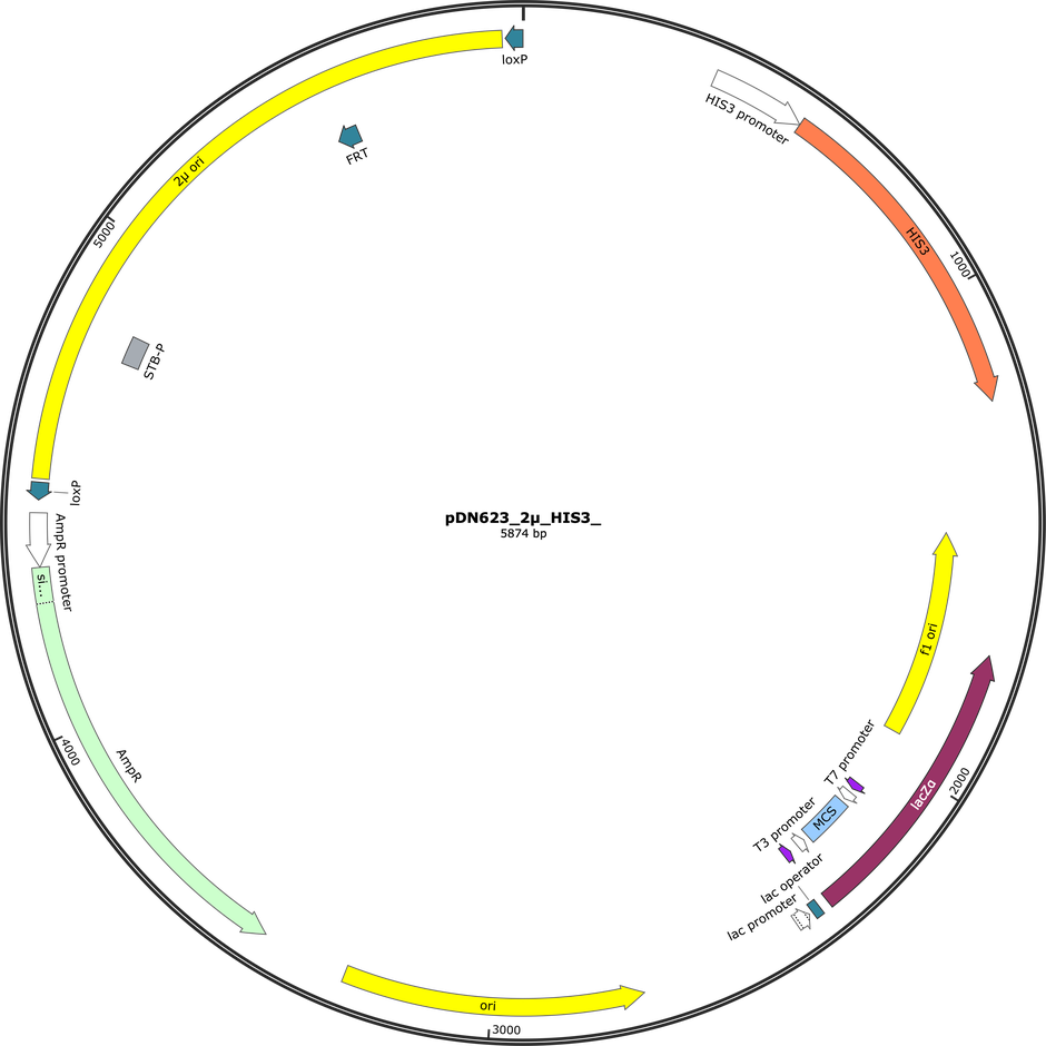 This plasmid was generated by modification of plasmid pRS403 (Sikorski & Hieter, 1989, Genetics 122:19-27) by insertion of 2 micron high copy S. cerevisiae replication and partitioning locus with flanking restriction enzyme cut sites (AatII) and flanking LoxP sites.