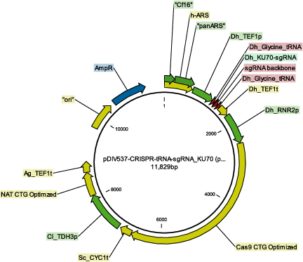 PurposePlasmid expressing optimized Cas9 and NAT marker and sgRNA targeting KU70 homolog in D. hansenii