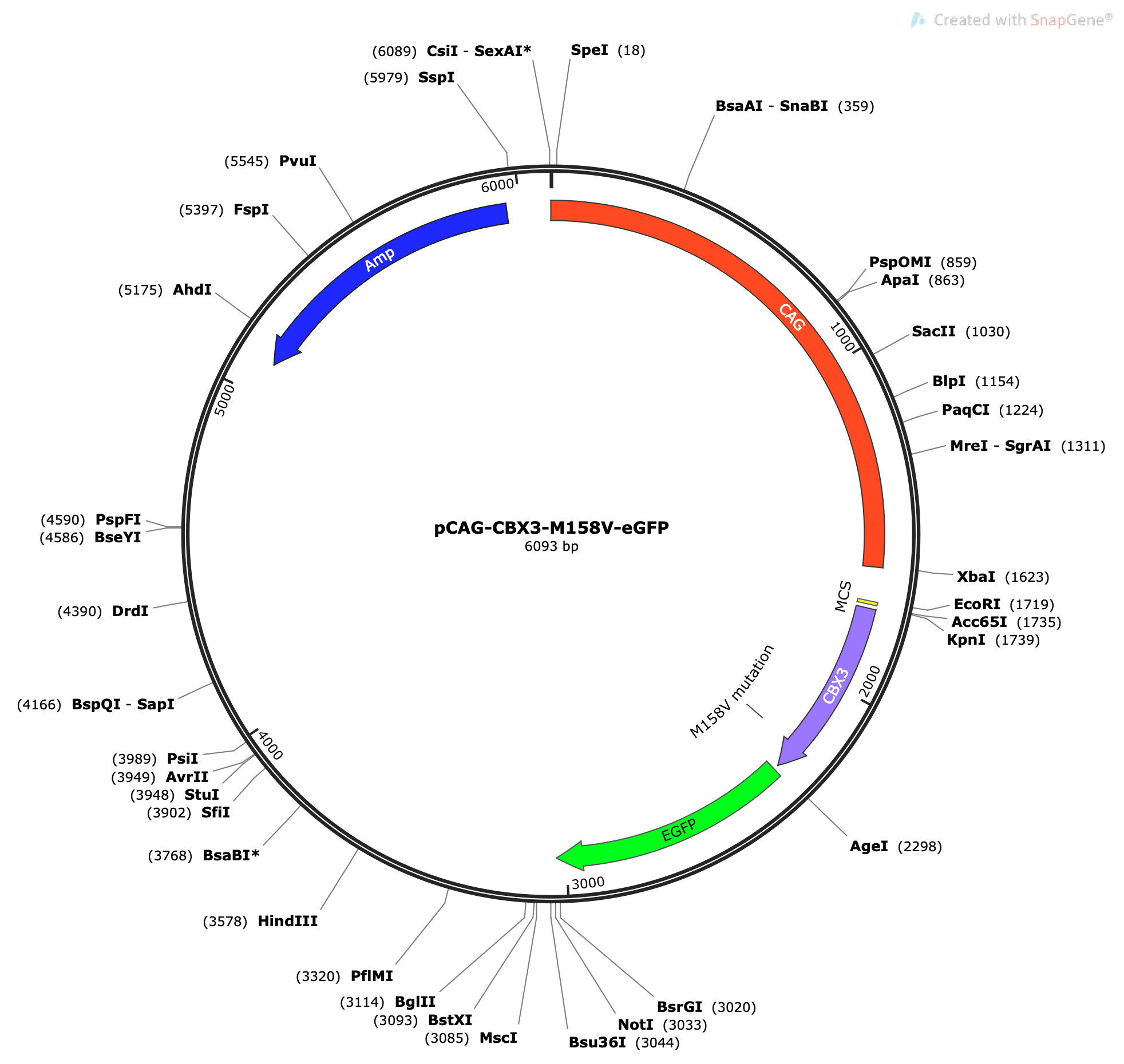 PurposeC terminal fusion of EGFP to mouse HP1γ (Cbx3) containing M158V mutation
