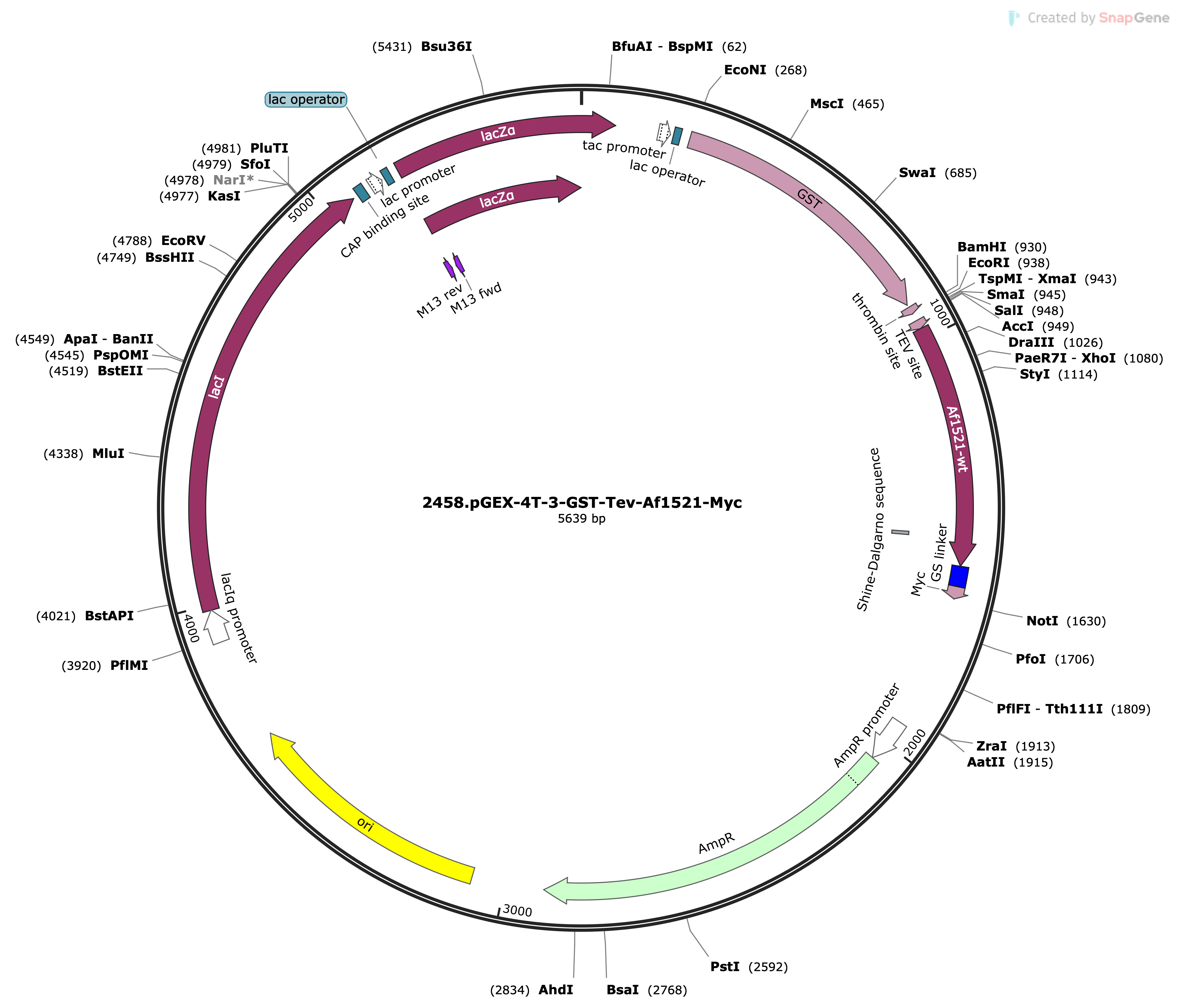 PurposeN-terminal GST fusion of Af1521(WT) with a TEV protease site located between the GST tag and Af1521 and a myc tag on the C terminus
