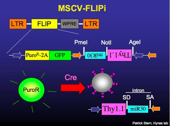 Constitutively expresses puromycin-resistance and GFP. Recombines to express surface Thy1.1 and miR30-based RNAi. The miRNA is contained within an artificial intron, and splicing of the intron can boost transgene expression (1.5 to 2-fold). The expression of surface Thy1.1 facilitates antibody-mediated cell sorting.