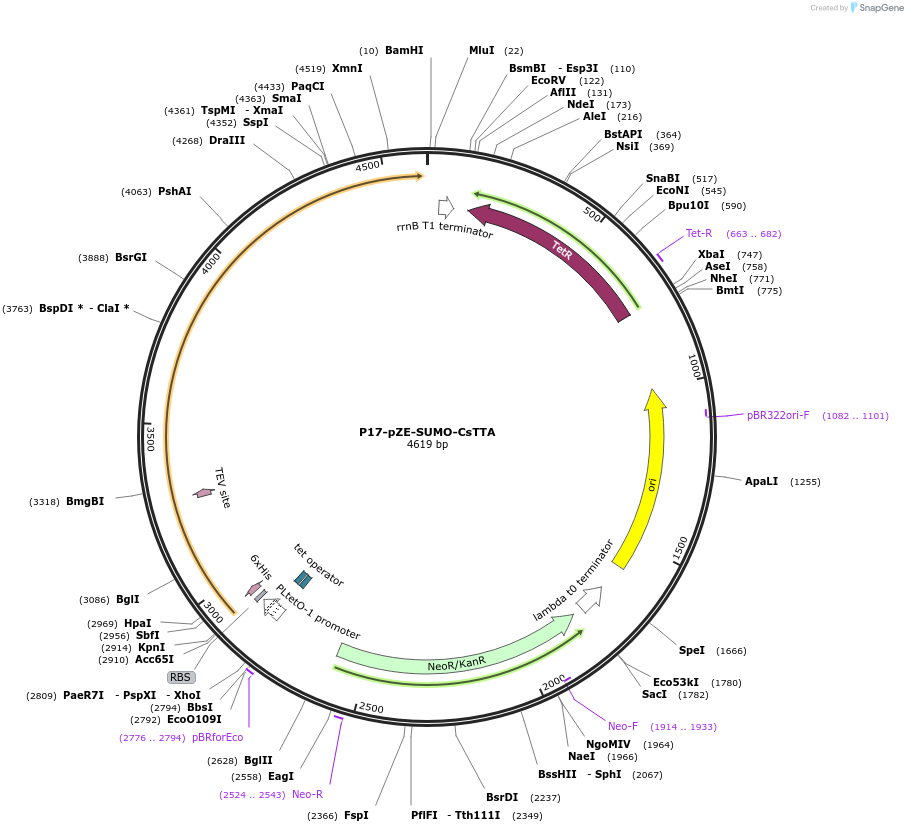 PurposeColE1 ori, KanR, TetR, Tet promoter with a codon optimized csTTA gene bearing an N-terminal hexahistidine tag followed by a SUMO tag and a TEV protease cleavage site.
