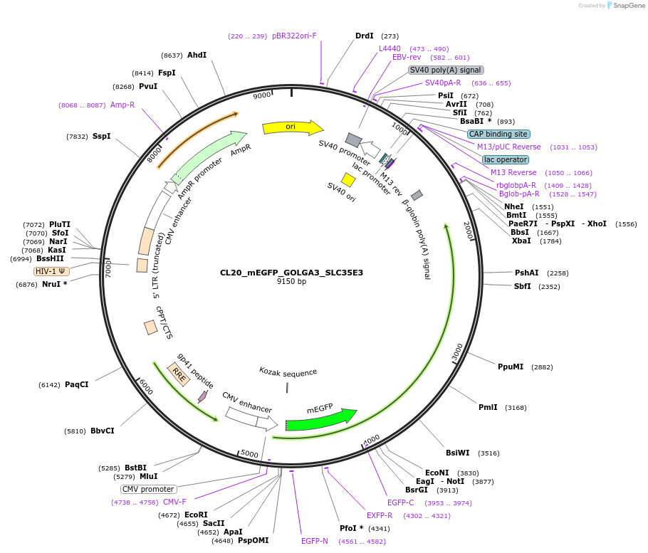 CL20_mEGFP_GOLGA3_SLC35E3 was a gift from Richard Kriwacki (Addgene plasmid # 205826 ; http://n2t.net/addgene:205826 ; RRID:Addgene_205826) -