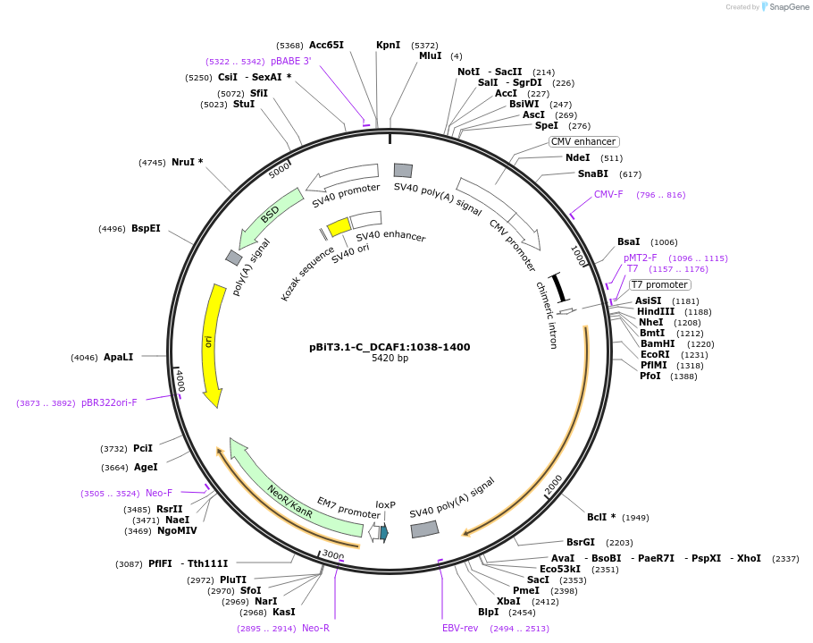 PurposeMammalian expression of human DCAF1 fragment E1038 to E1400. C-terminal HiBiT tag.