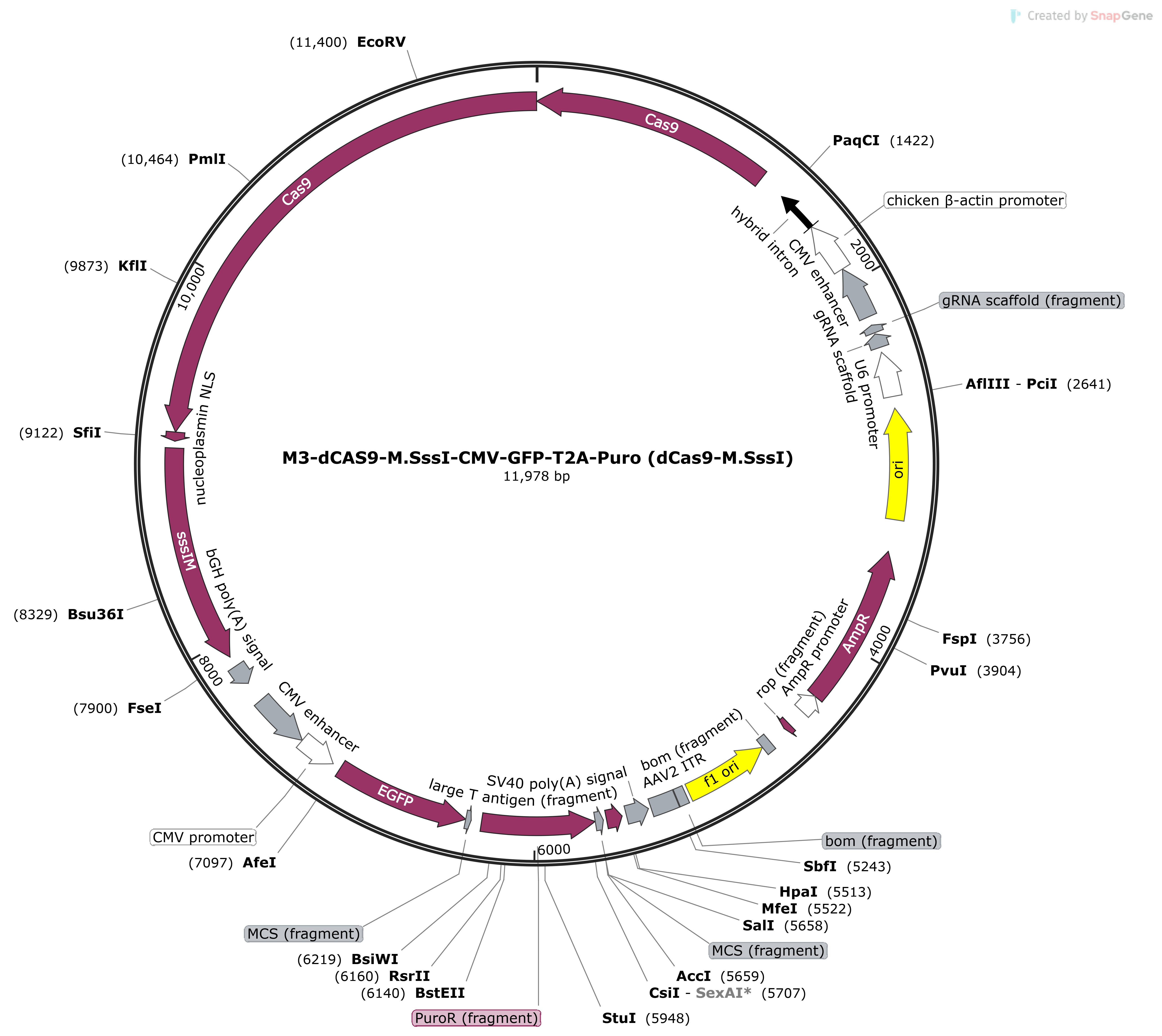PurposeExpresses dCAS9-M.SssI fusion protein and double marker GFP-T2A-Puro under independent promoters