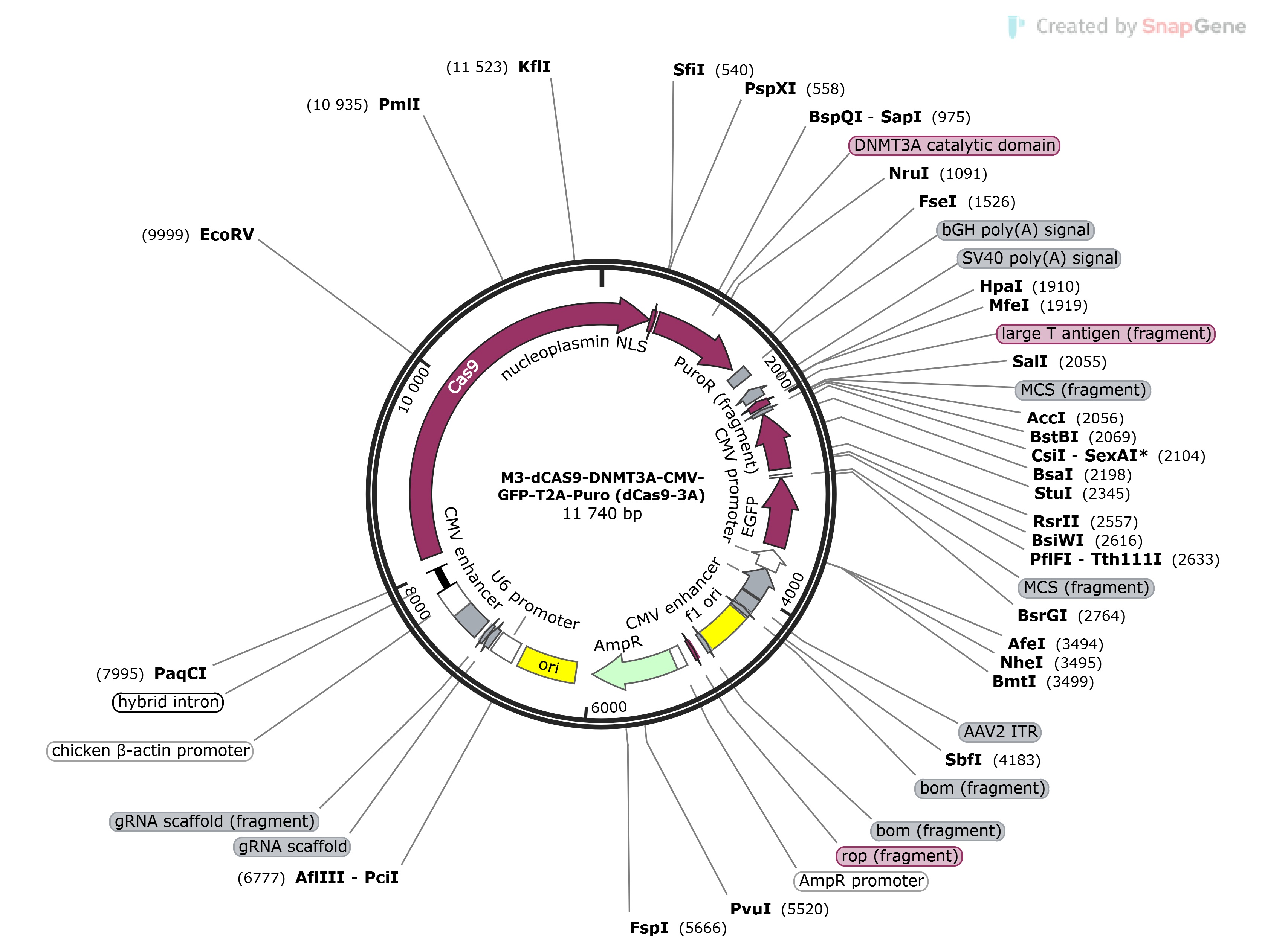 PurposeExpresses dCAS9-DNMT3A fusion protein and double marker GFP-T2A-Puro under independent promoters