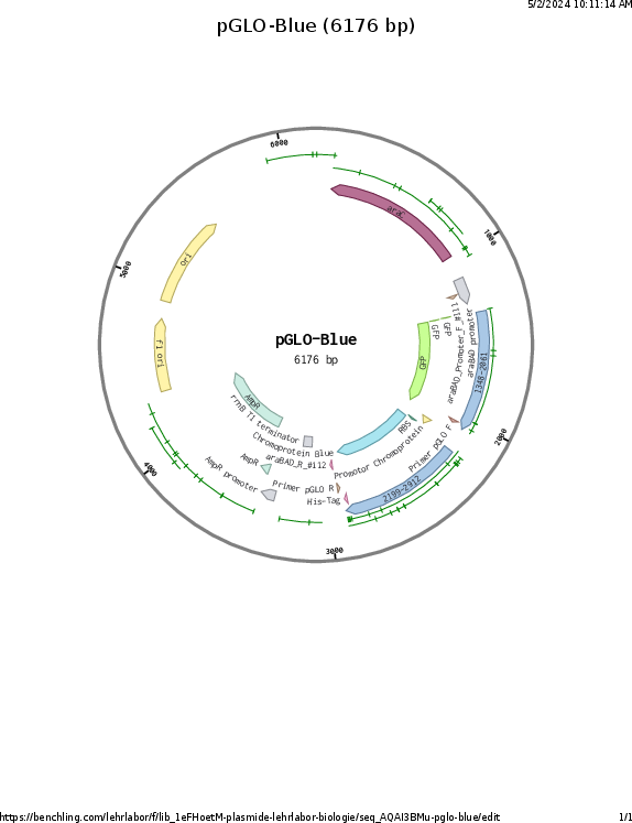 A portion of this plasmid was derived from a plasmid made byThe backbone plasmid (pGLO) was purchased by Bio-Rad. It is an educational plasmid. For the insert it was used the plasmids of amino labs (https://amino.bio/products/engineer-it-kit)