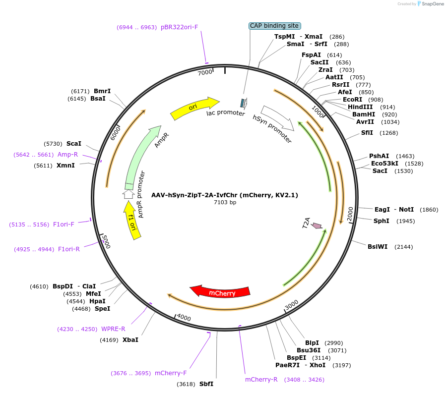 AAV-hSyn-ZipT-2A-IvfChr (mCherry, KV2.1) was a gift from John Lin (Addgene plasmid # 221621 ; http://n2t.net/addgene:221621 ; RRID:Addgene_221621) -