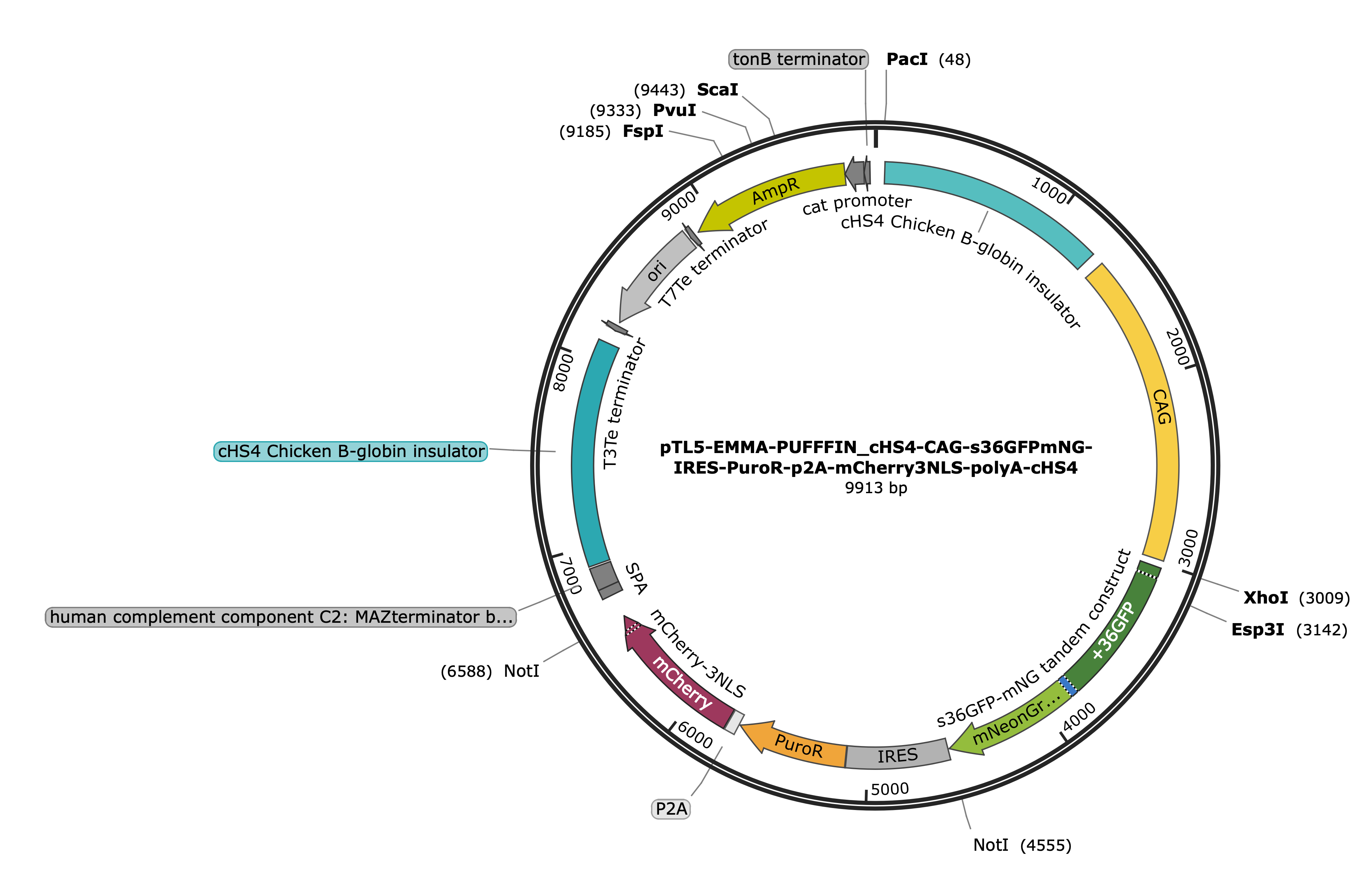 PurposePUFFFIN cassette with s36GFP-mNeonGreen and mCherry-3NLS, strong constitutive promoter CAG, insulated by cHS4 for random integration, puromycin resistance for selection in mammalian cells