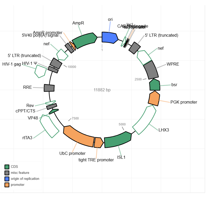 Modifications to backboneVector contains both the rtTA(advanced) derived from pLVX-rtTA(advanced) (Clontech) driven by the UbC promoter, as well as ISL1:T2A:LHX3 driven by the TREtight promoter