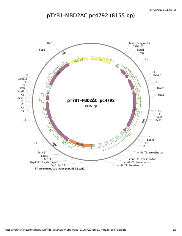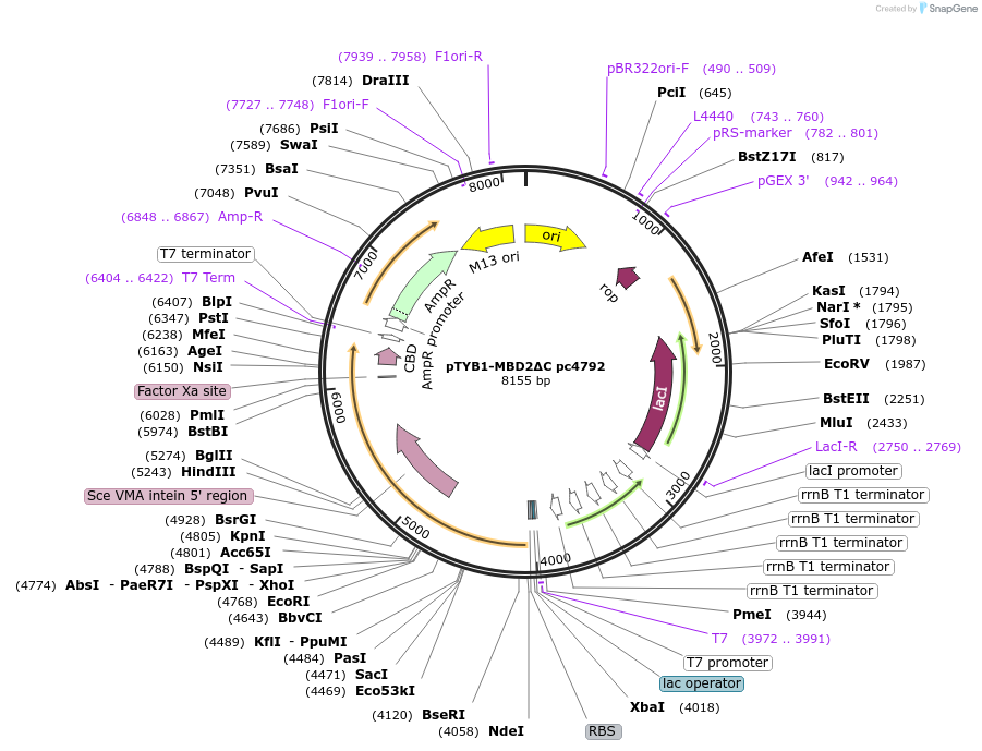 PurposeBacterial expression plasmid of MBD2∆C lacking the C-terminus (a 236-414). C-terminal tagged to intein.