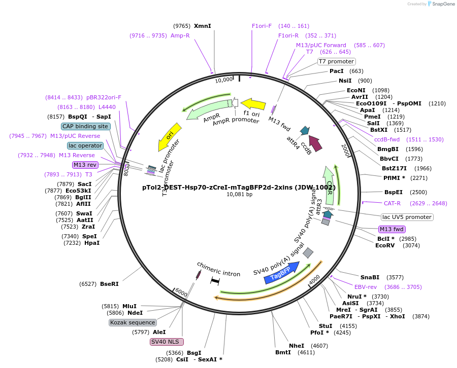 Vector backbonepTol2-Hsp70-zCreI-mTagBFP2d-2x-ins