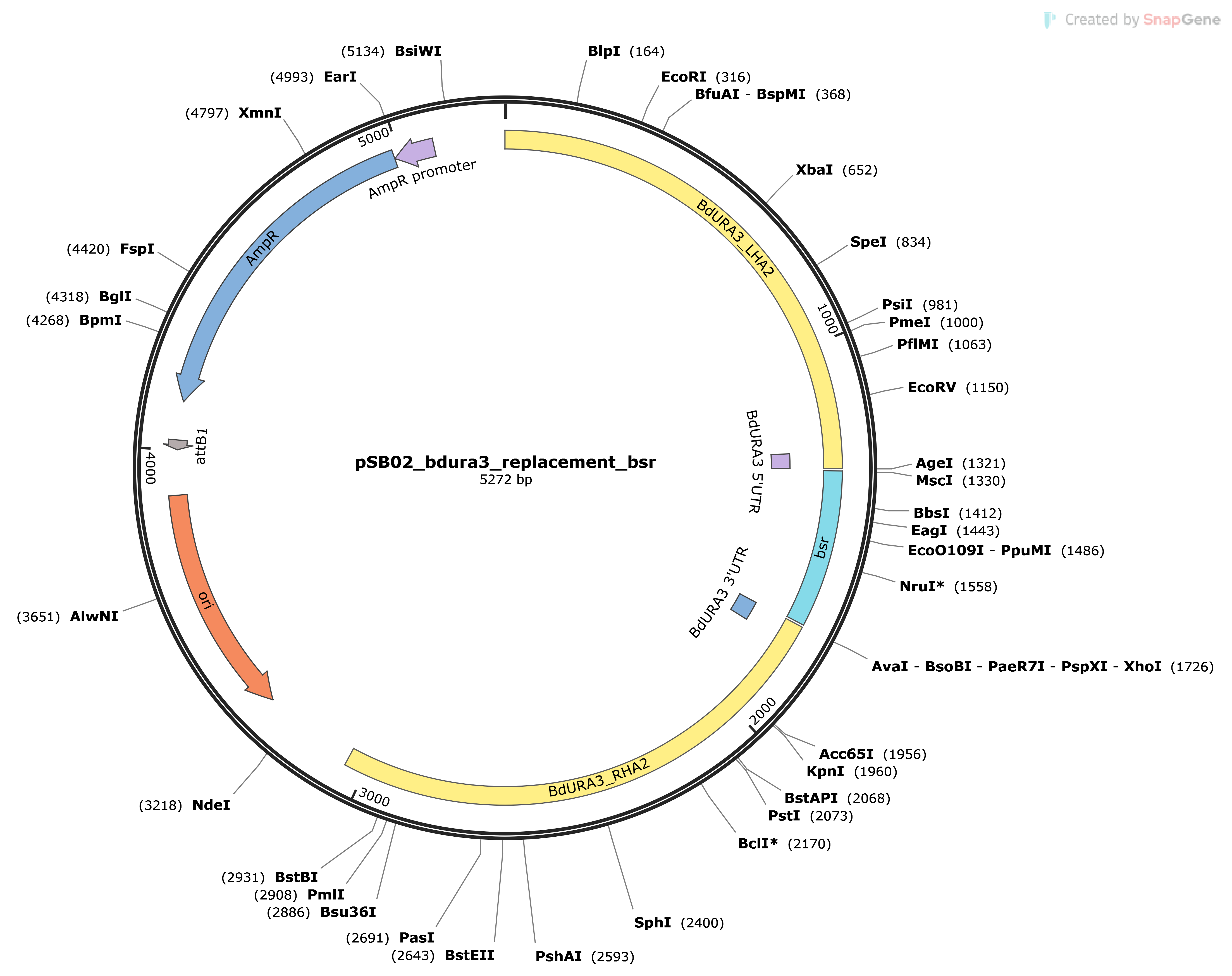 PurposeB. dendrobatidis plasmid for integration of target sequence at URA3 locus, blasticidin S selection