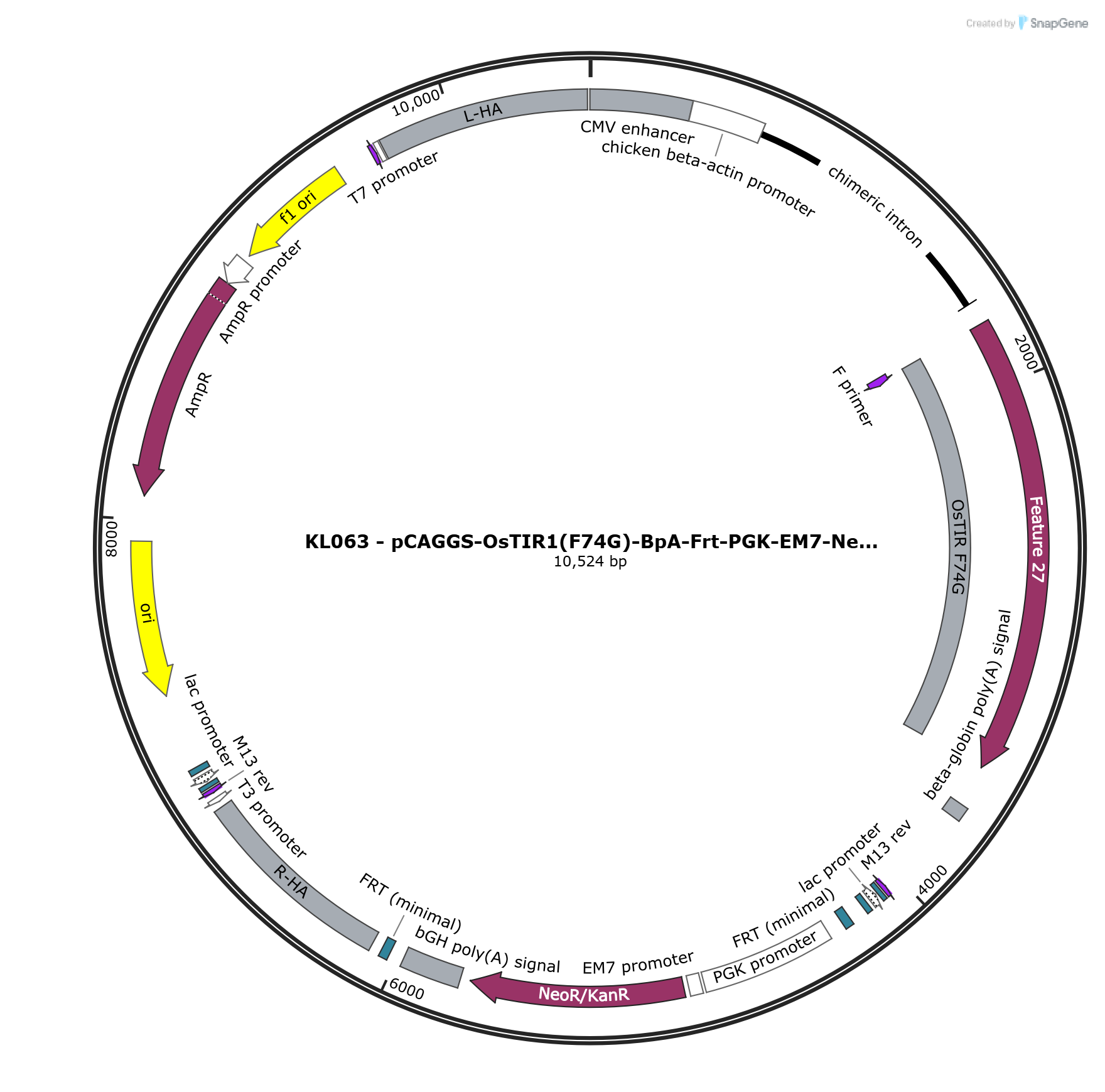 KL063 - pCAGGS-OsTIR1(F74G)-BpA-Frt-PGK-EM7-NeoR-bpA-Frt-Rosa26