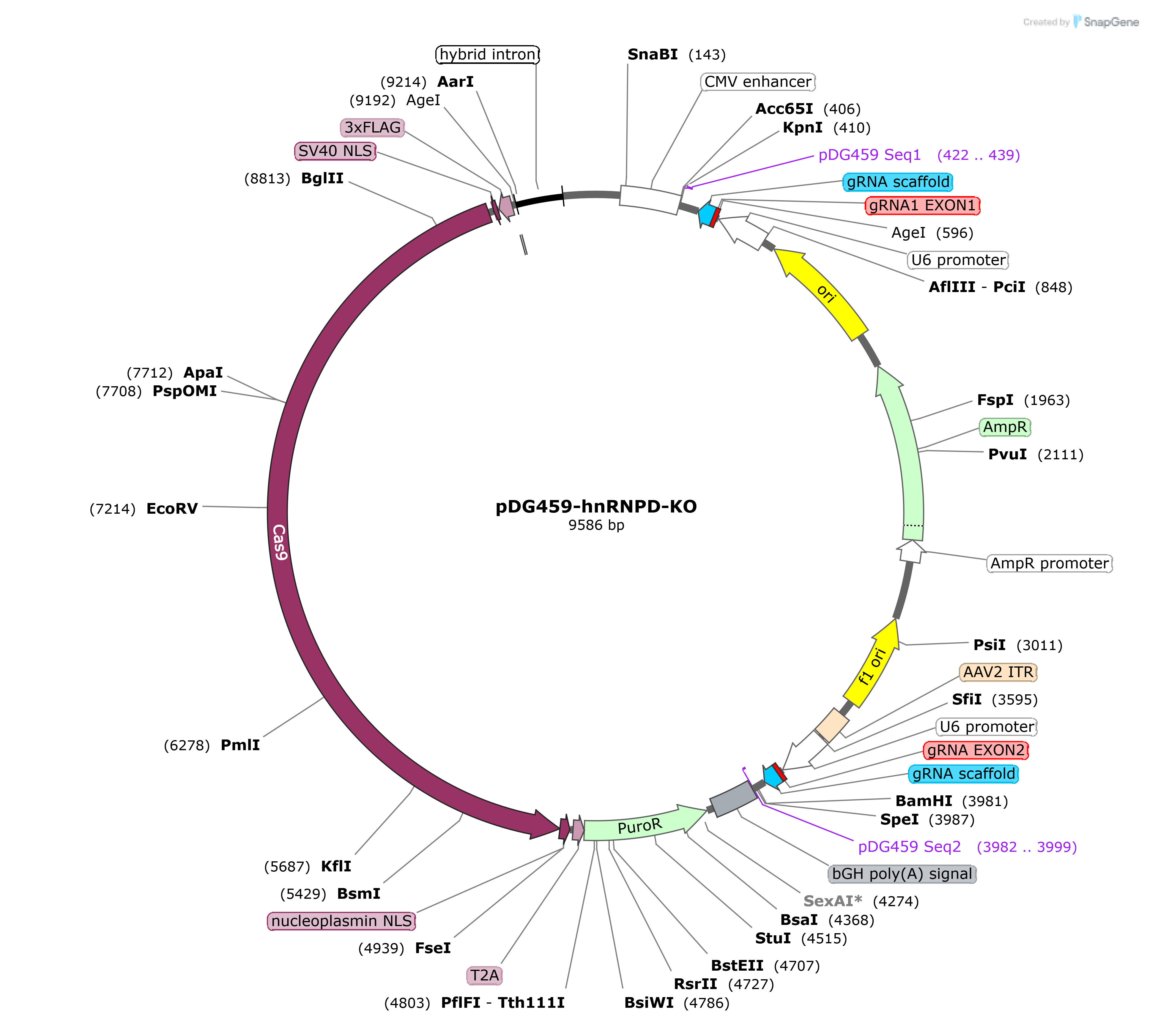 pDG459-HNRNPD-KO was a gift from Shyam Chauhan (Addgene plasmid # 233287 ; http://n2t.net/addgene:233287 ; RRID:Addgene_233287)