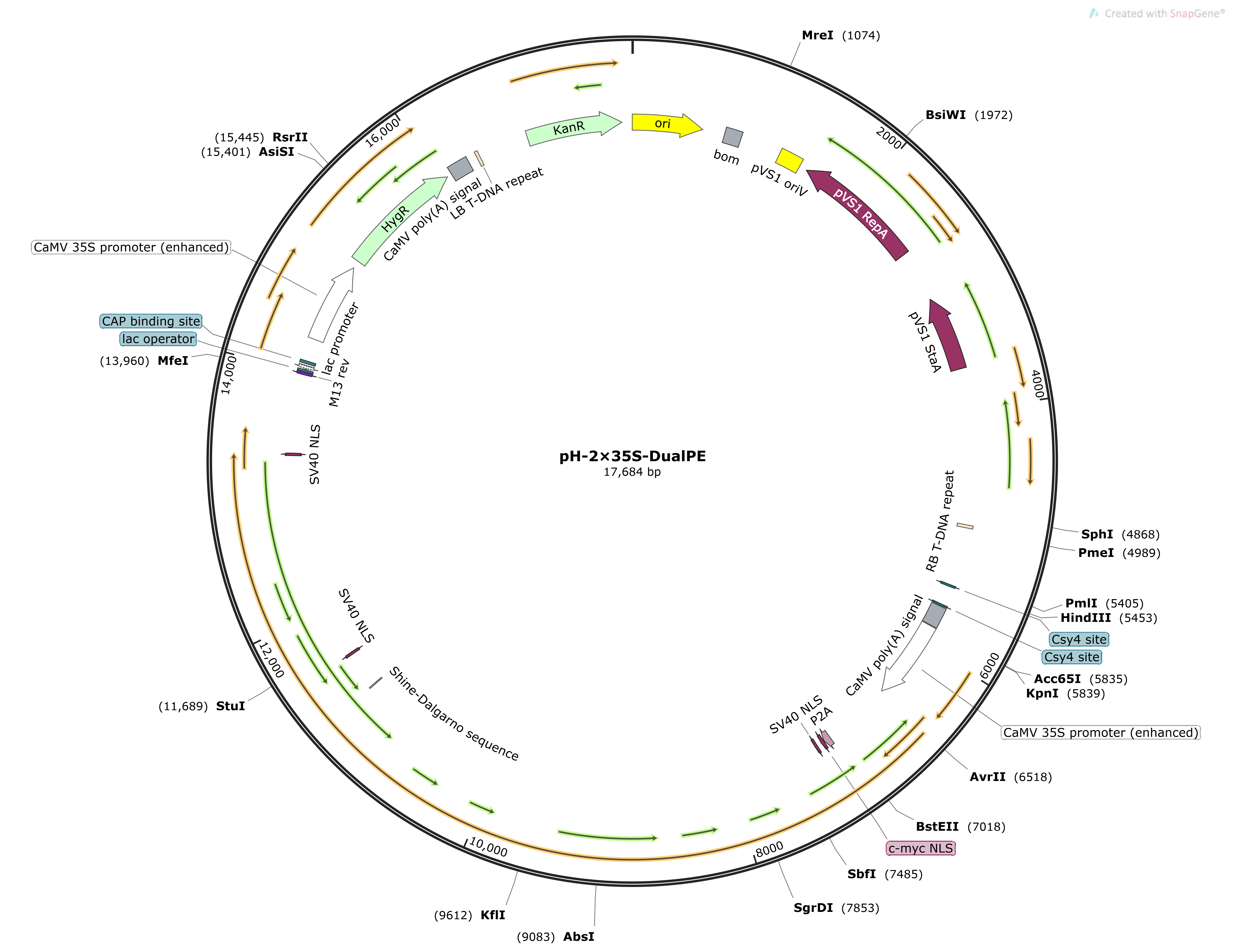 pH-2×35S-DualPE was a gift from Zong Yuan (Addgene plasmid # 236416 ; http://n2t.net/addgene:236416 ; RRID:Addgene_236416) -