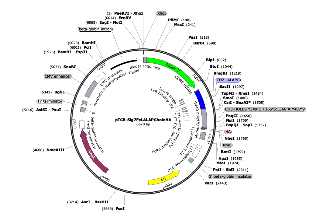 PurposepTwist CMV BetaGlobin encoding Siglec-7-Fc with LALA P329G hole Fc and HA tag