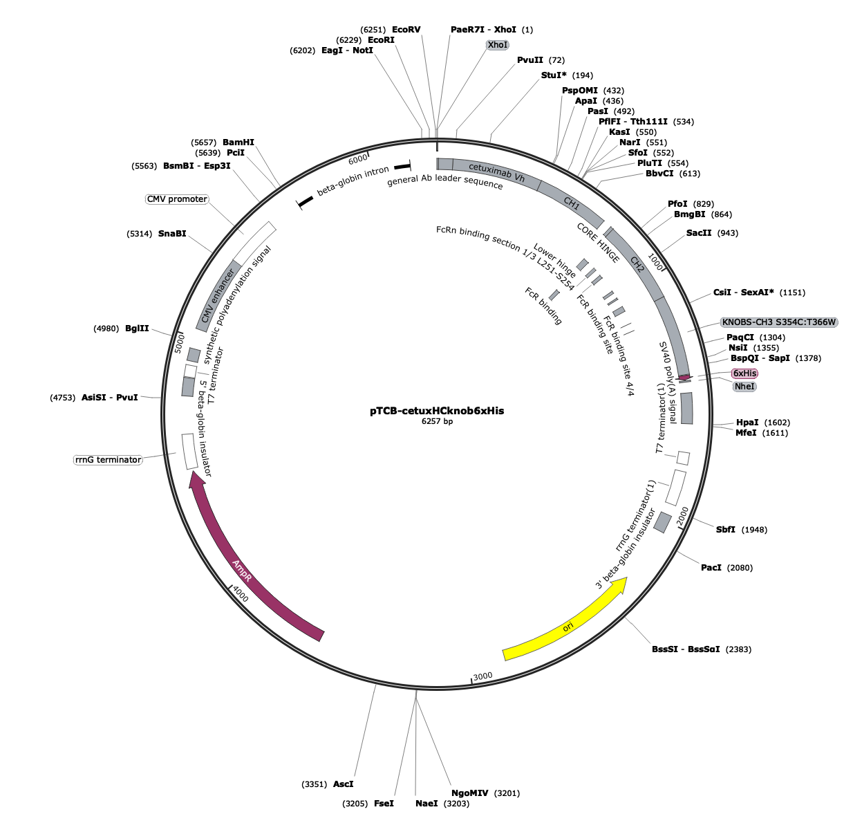 PurposepTwist CMV BetaGlobin encoding cetuximab heavy chain with knob Fc and 6xHis tag