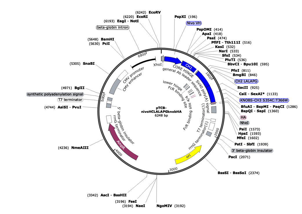 PurposepTwist CMV BetaGlobin encoding nivolumab heavy chain with LALA P329G knob Fc and HA tag