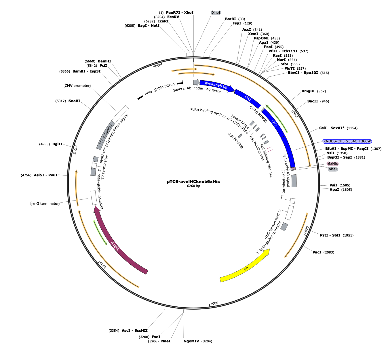 PurposepTwist CMV BetaGlobin encoding avelumab heavy chain with knob Fc and 6xHis tag