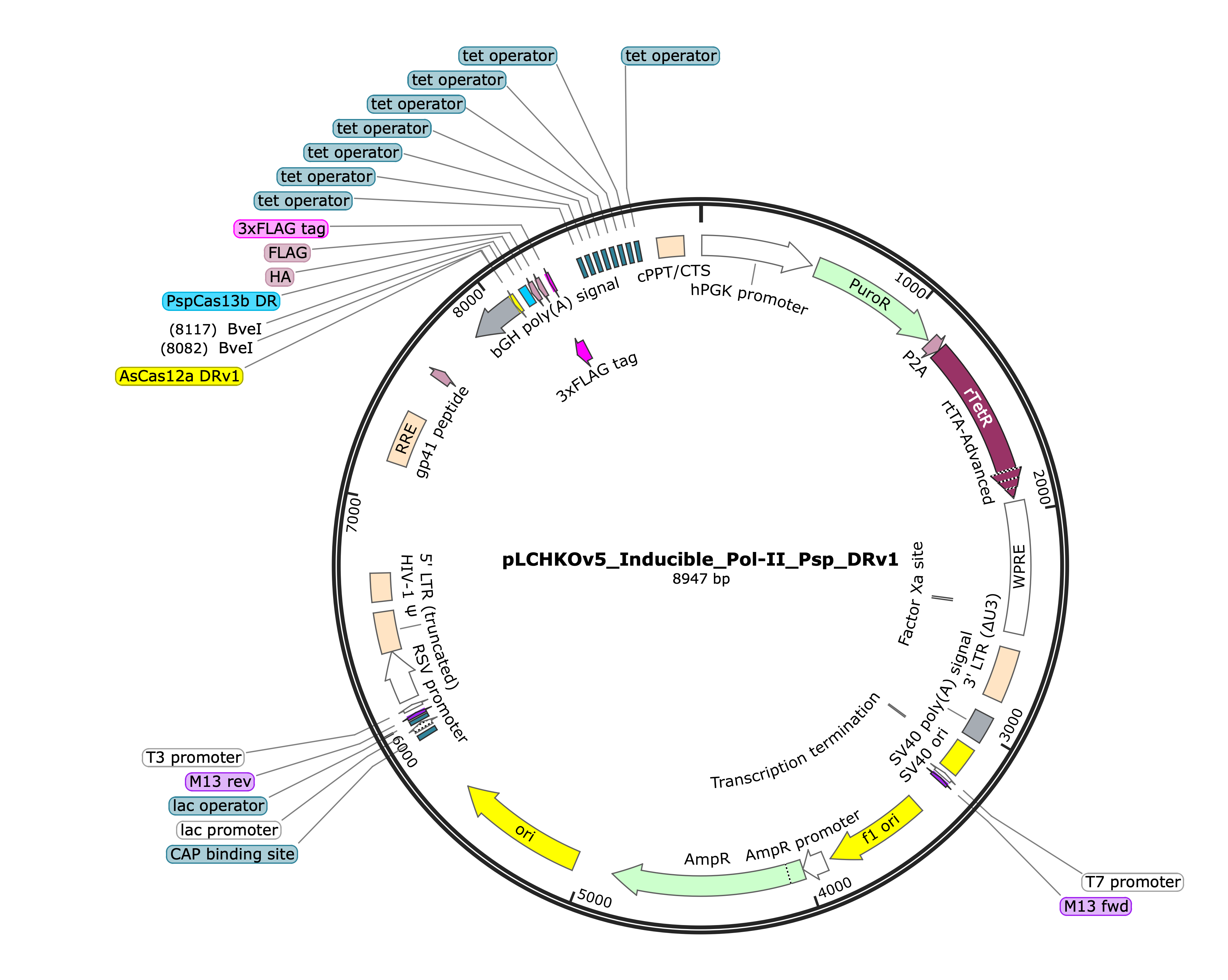 These hgRNAs are processed by Cas13b to cleave the capped 5' end and by Cas12a to remove the polyadenylated 3' end (nucleases not encoded on this plasmid). The vector contains BveI cloning sites and includes a puromycin resistance marker for selection.