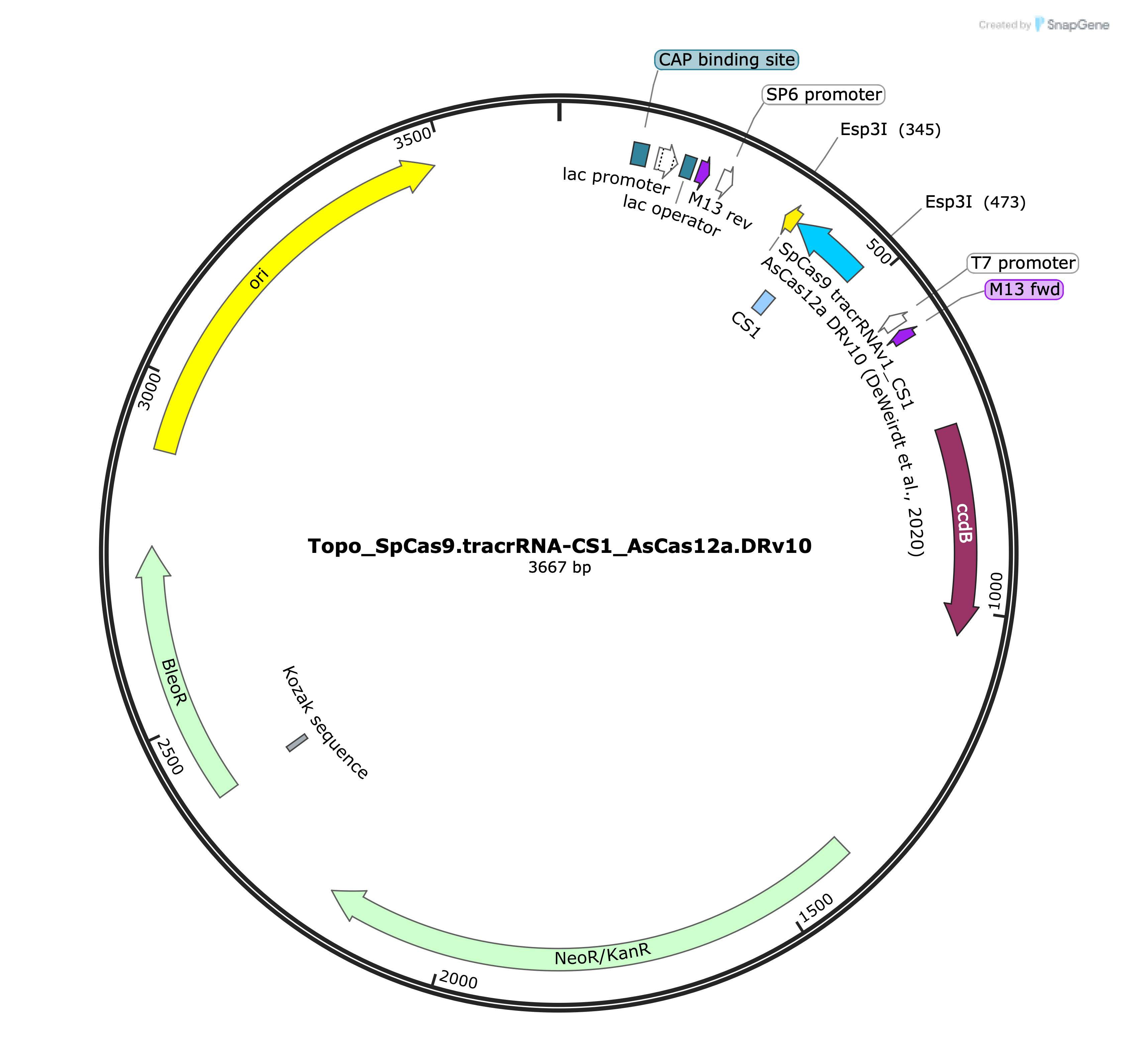 Topo_SpCas9.tracrRNA-CS1_AsCas12a DRv10 was a gift from Thomas Gonatopoulos-Pournatzis (Addgene plasmid # 237553 ; http://n2t.net/addgene:237553 ; RRID:Addgene_237553)