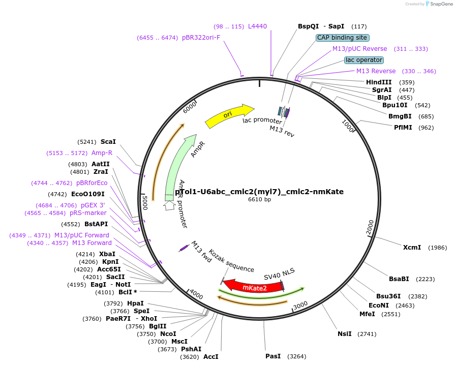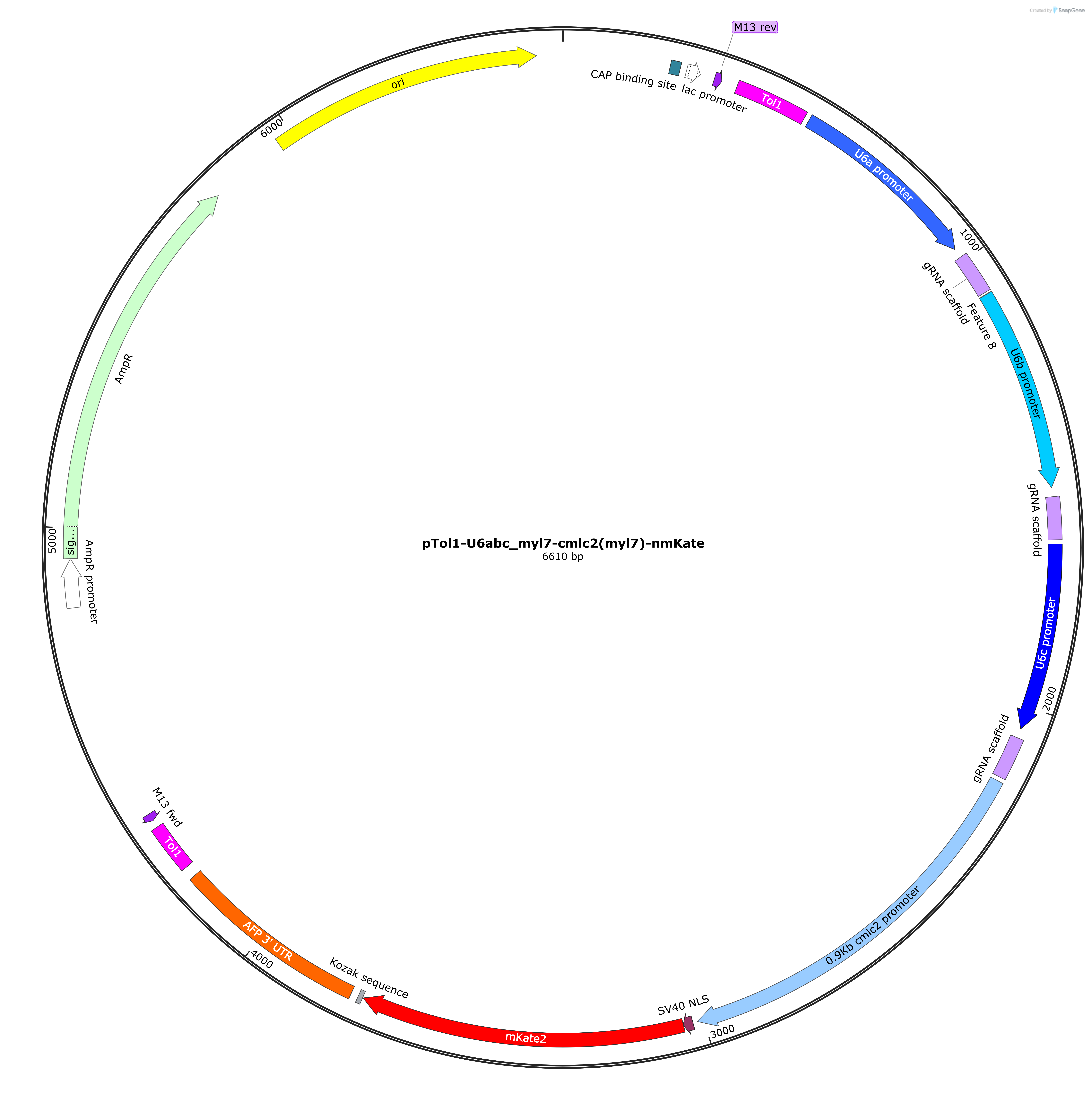 - Promoter cmlc2 (nmKate); U6 (gRNAs)