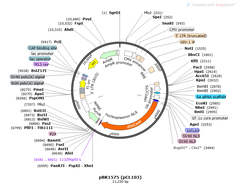 Gene/Insert namepLV-U6-[empty]-EFSNC-dSaCas9-[empty linker]-P2A-Puro-WPRE