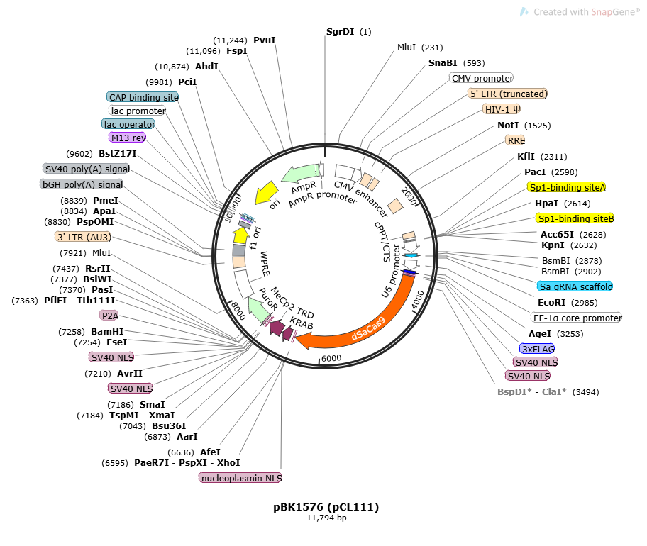 Gene/Insert namepLV-U6-[empty]-EFSNC-dSaCas9-KRAB-MeCp2-P2A-Puro-WPRE
